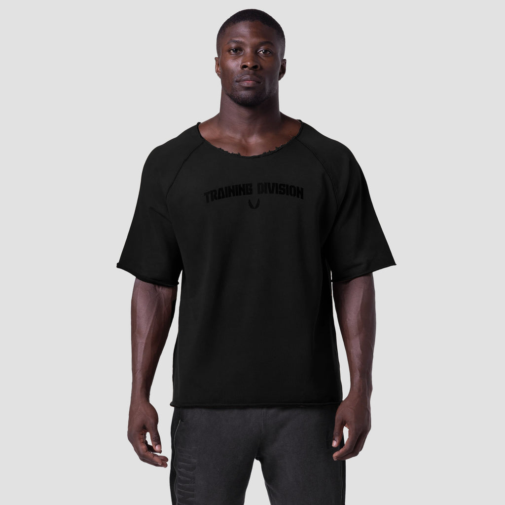 Oversized raglan tee designed as a modern pump cover with raw edge finishes and reactive "sun fade" dyeing to convey a naturally worn, vintage aesthetic. Constructed with a wide neck opening, relaxed sleeves, and a draped fit for layering. Completed with our “Training Division” varsity graphic at the chest and a woven patch label at the back neck.