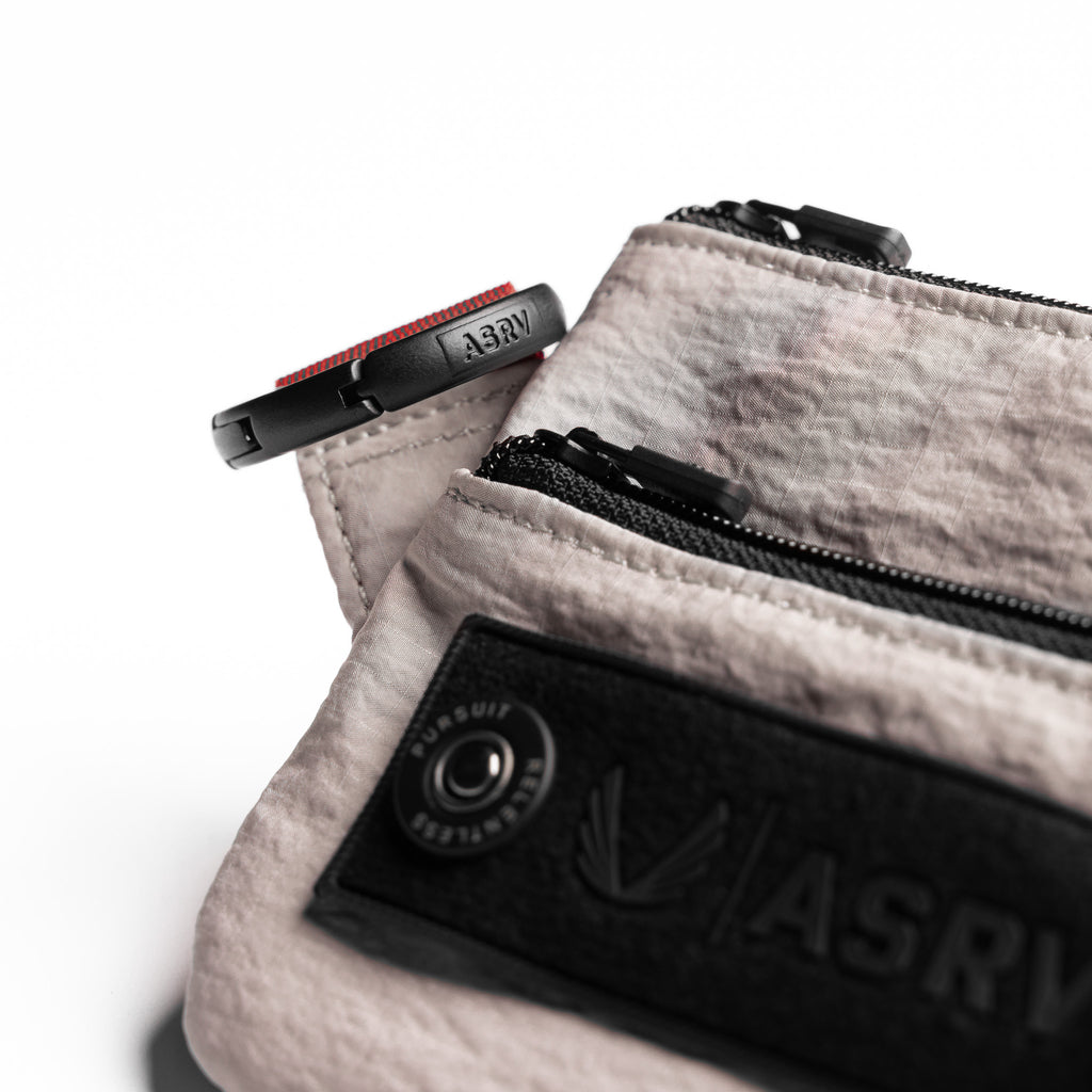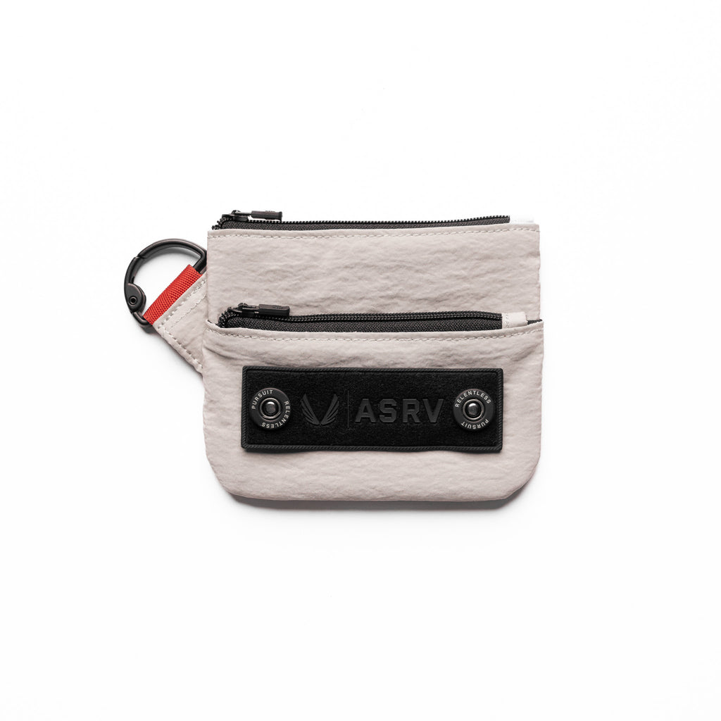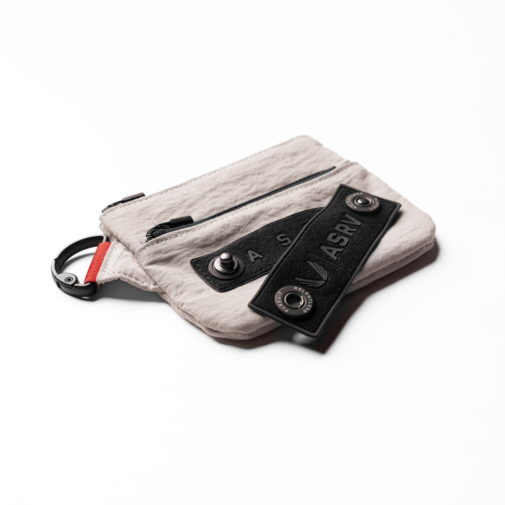 Minimalist clip bag for essentials on the go. Ripstop fabric with a 1500mm waterproof rating shields contents from rain and moisture when clipped externally. Zip main compartment with small nylon puller provides secure, quick access. Gunmetal D-ring spring clip attaches to any bag, belt loop, or kit. Finished with a woven "Wings | ASRV" snap patch and 1" red webbing loop.