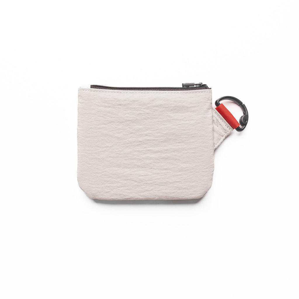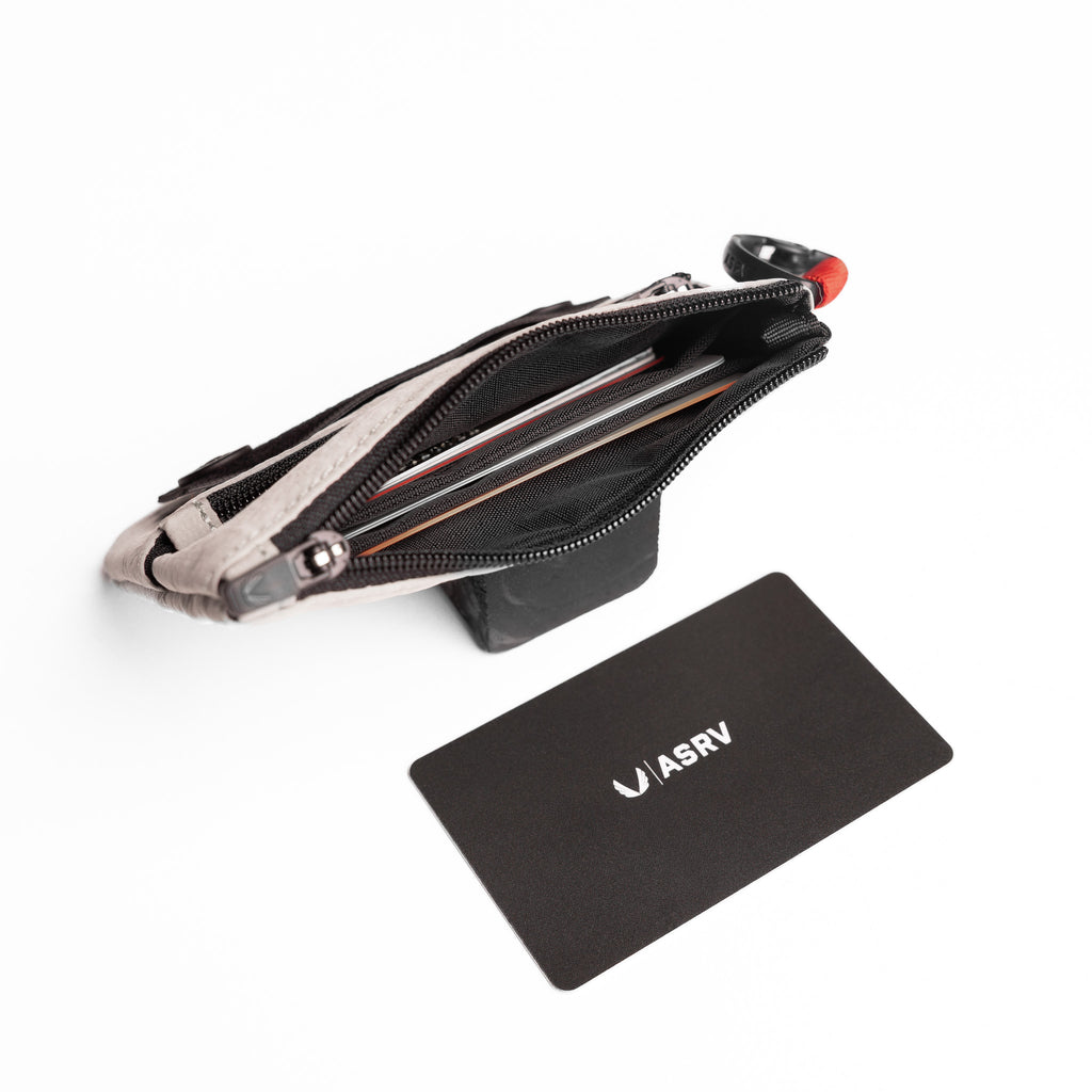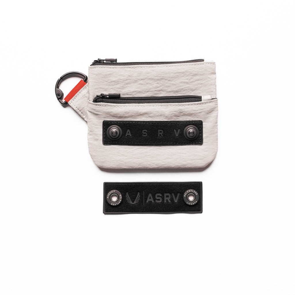 Minimalist clip bag for essentials on the go. Ripstop fabric with a 1500mm waterproof rating shields contents from rain and moisture when clipped externally. Zip main compartment with small nylon puller provides secure, quick access. Gunmetal D-ring spring clip attaches to any bag, belt loop, or kit. Finished with a woven "Wings | ASRV" snap patch and 1" red webbing loop.