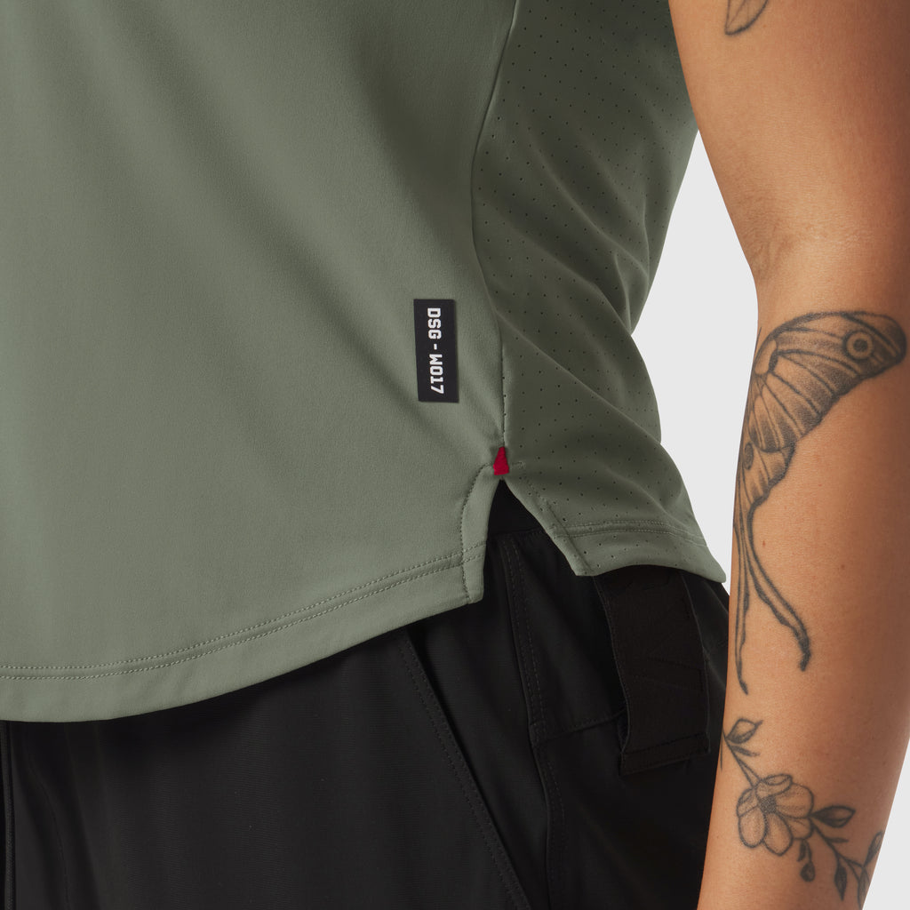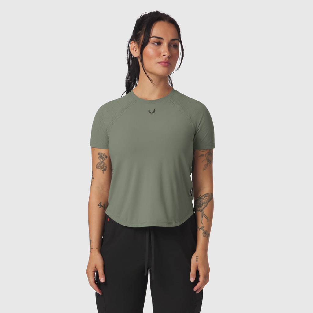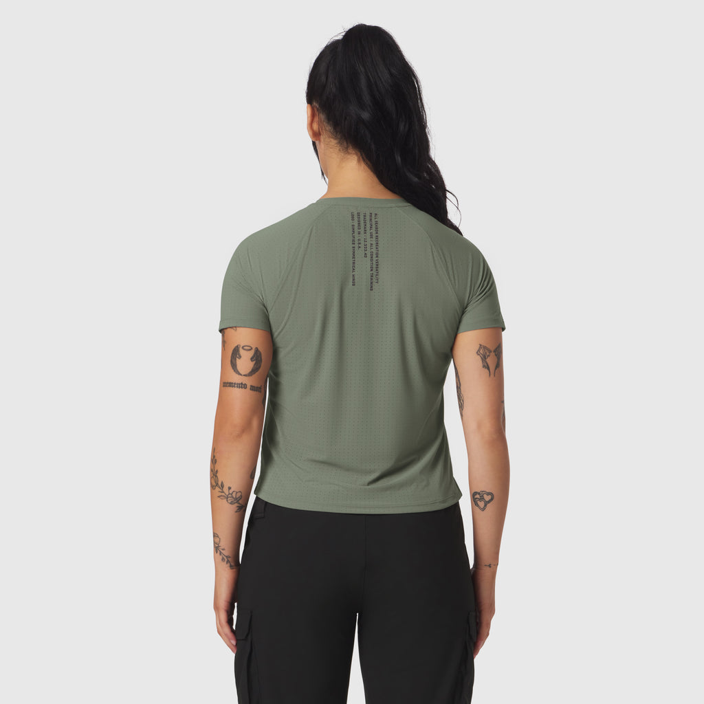 Lightweight, perforated training tee constructed from Laser-Vent™, a warp-knit performance fabric with extreme stretch and shape retention. Strategically ventilated in high-sweat zones, with a non-perforated chest panel for coverage. Features reinforced side split seams and reflective logo details for visibility during low-light training.
