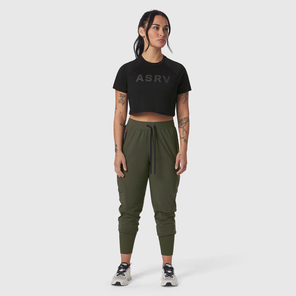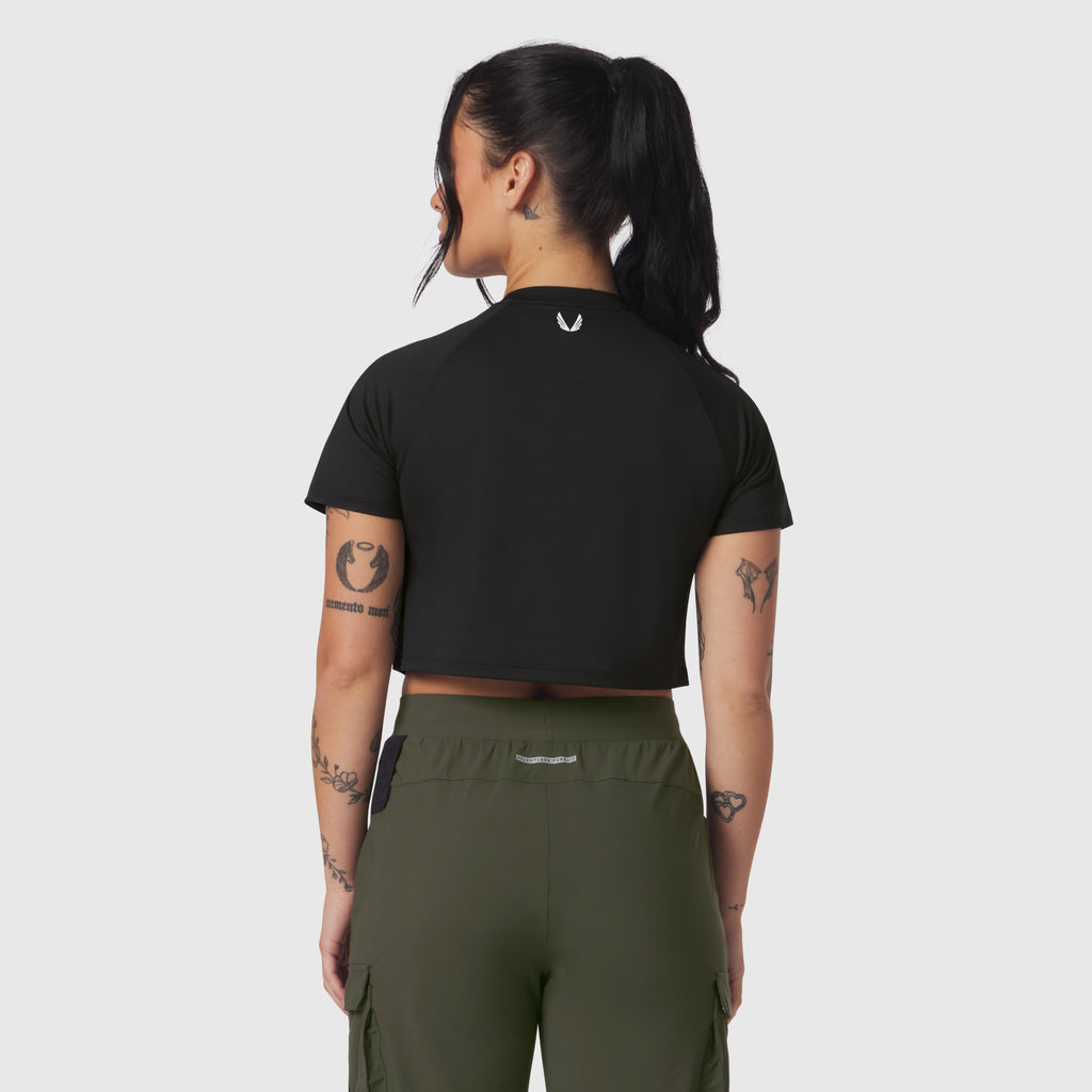 Lightweight mid-crop training tee made from AeroSilver®, our next-generation silver-infused performance fabric built for durability, breathability, and odor resistance. Designed with a curved hem and side splits reinforced with tack seams for added flexibility. Reflective logo details provide visibility during low-light workouts.