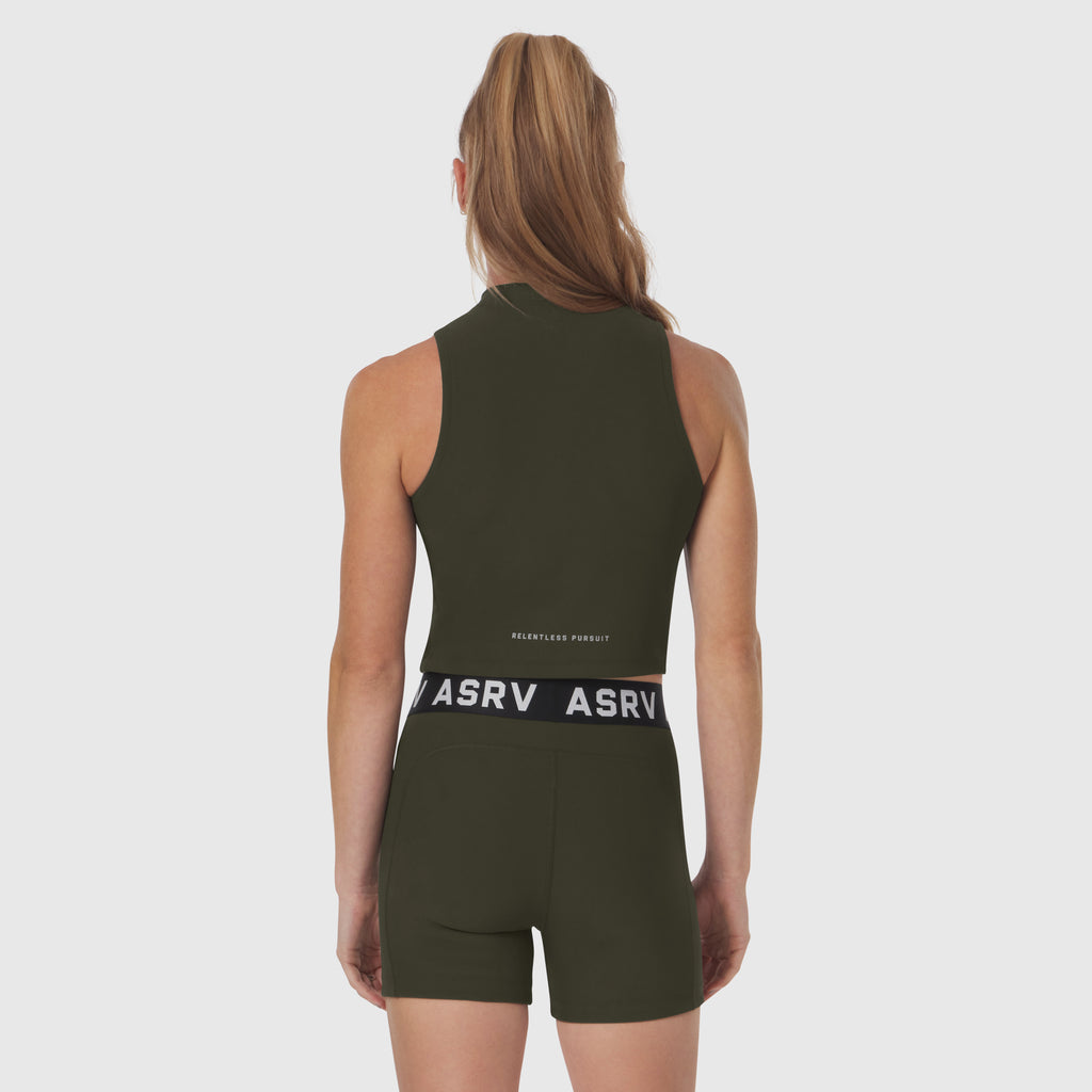 A cropped training tank designed with a structured mockneck collar and a slim, sculpted fit. Made from a stretch-engineered ribbed fabric that offers breathable compression and shape retention. The cropped length allows full range of motion, while the mockneck provides a confident, modern silhouette. Finished with reflective branding for visibility during low-light sessions.