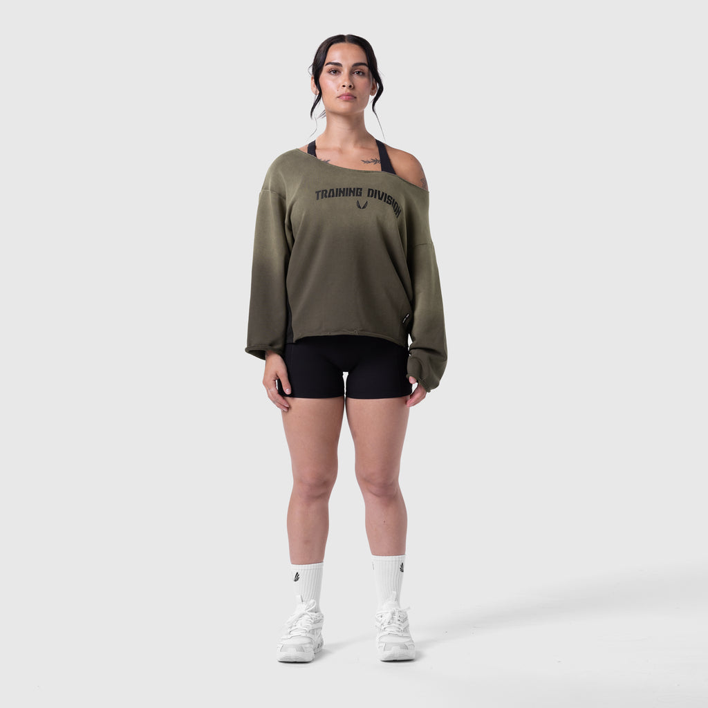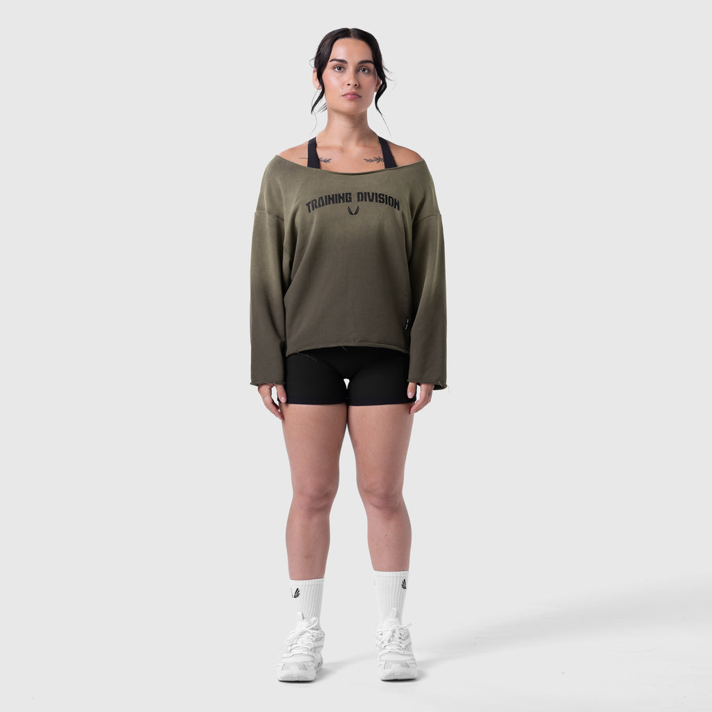 Oversized women’s crewneck constructed from our signature Tech-Terry™ fabric, combining the soft handfeel of French Terry with four-way stretch. Finished with raw edge detailing at the collar, cuffs, and hem for a raw, deconstructed look. Double-layer Ion-Mesh™ side panels provide breathability and contour to the silhouette. Completed with our “Training Division” varsity graphic at the chest, a woven patch label at the back neck, and a reactive sun-fade wash for a naturally worn finish.