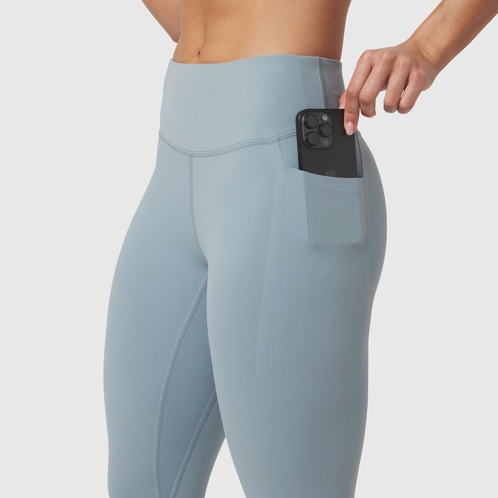 Performance legging engineered for multi-activity versatility. Constructed from our advanced, patented LYCRA® ADAPTIV fabric, offering superior stretch, support, and shape retention. Four-pocket storage system includes two internal pockets for secure phone and essentials storage, plus two thigh pockets for quick-access carry. Reflective multi-text graphic on each thigh completes the design.